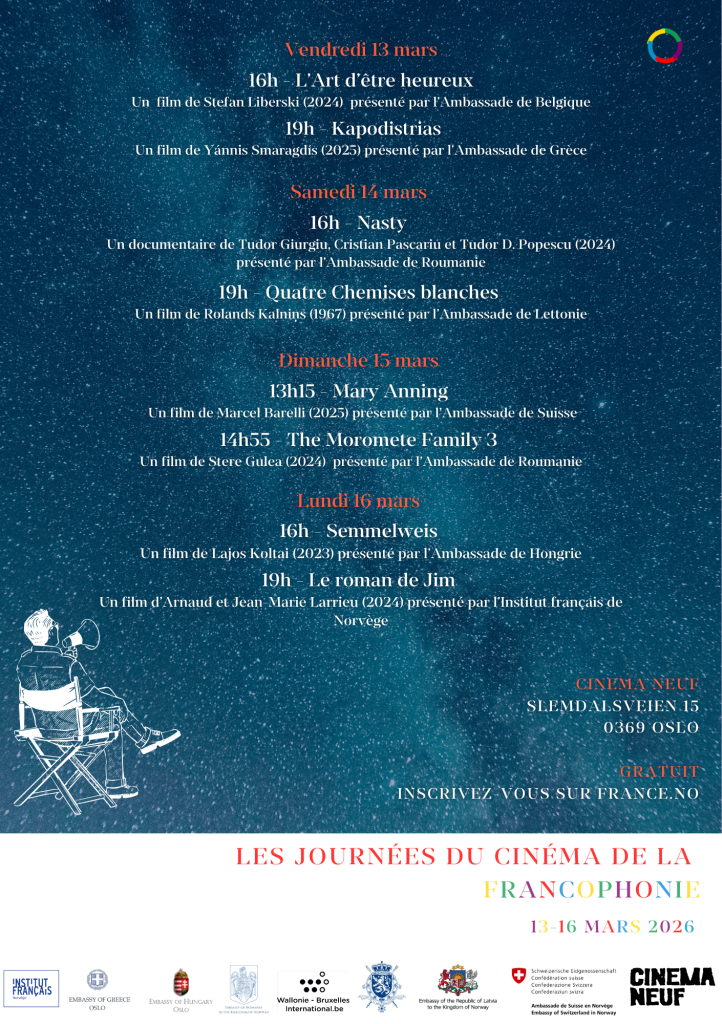 Dans le cadre du Festival de la Francophonie, l’Institut français de Norvège et le groupe des ambassades francophones d’Oslo organisent huit projections au Cinema Neuf.