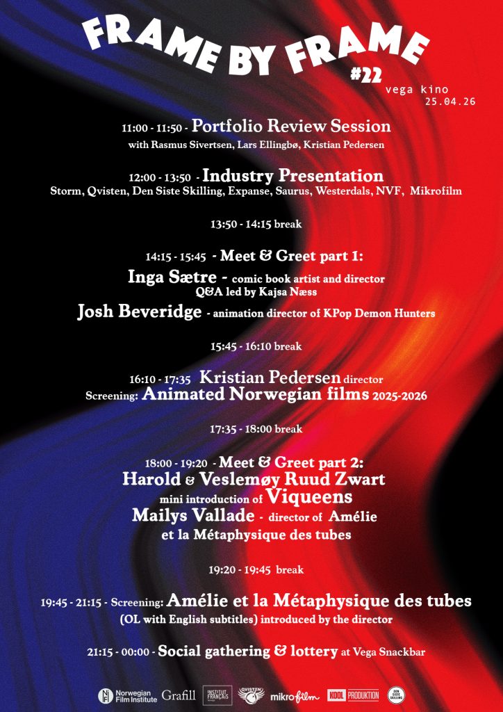 Frame by Frame revient cette année pour sa 22ᵉ édition, le 25 avril 2026. L’événement est organisé par Grafill (Yaprak Morali) et le Norwegian Film Institute, avec le soutien et la participation active de l’Institut français de Norvège, partenaire engagé dans la promotion de la création et de l’animation.