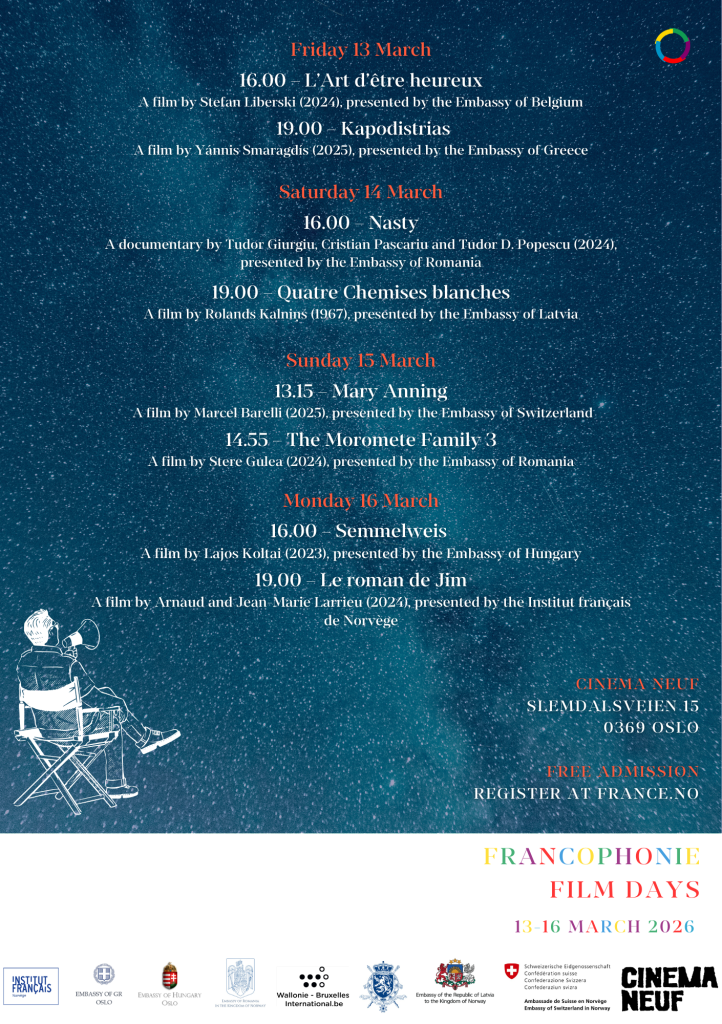 As part of the Festival of the Francophonie, the Institut français de Norvège and the group of Francophone Embassies in Oslo are organizing eight film screenings at Cinema Neuf.